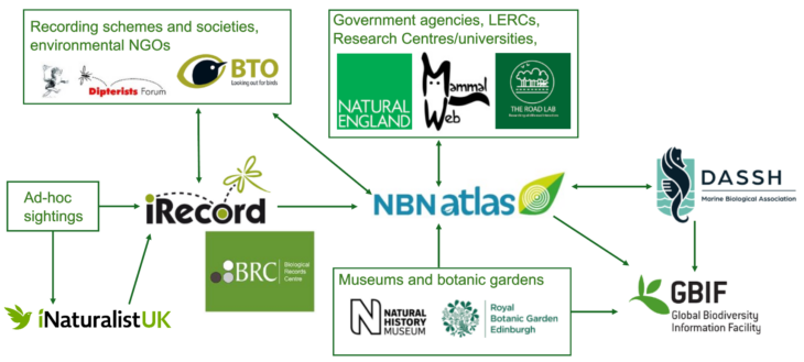 The easiest way for individuals to share their records is via the iNaturalist and iRecord platforms. The NBN Trust is the lead for iNaturalistUK, read more here. The Biological Records Centre maintain the iRecord platform, read more here.
