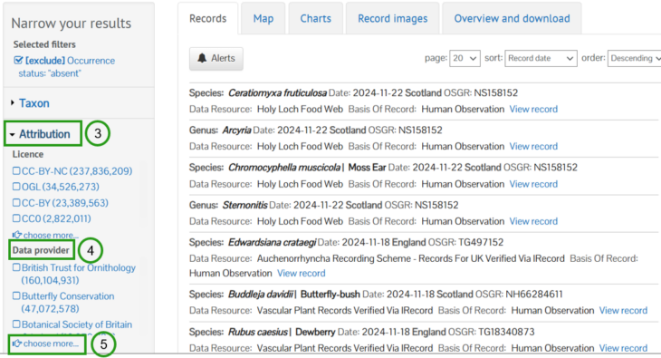 5. Now click on Attribution (3) in the Narrow your results panel. Under the Data provider (4) facets, click choose more… (5)